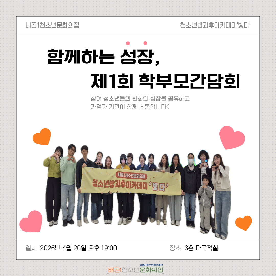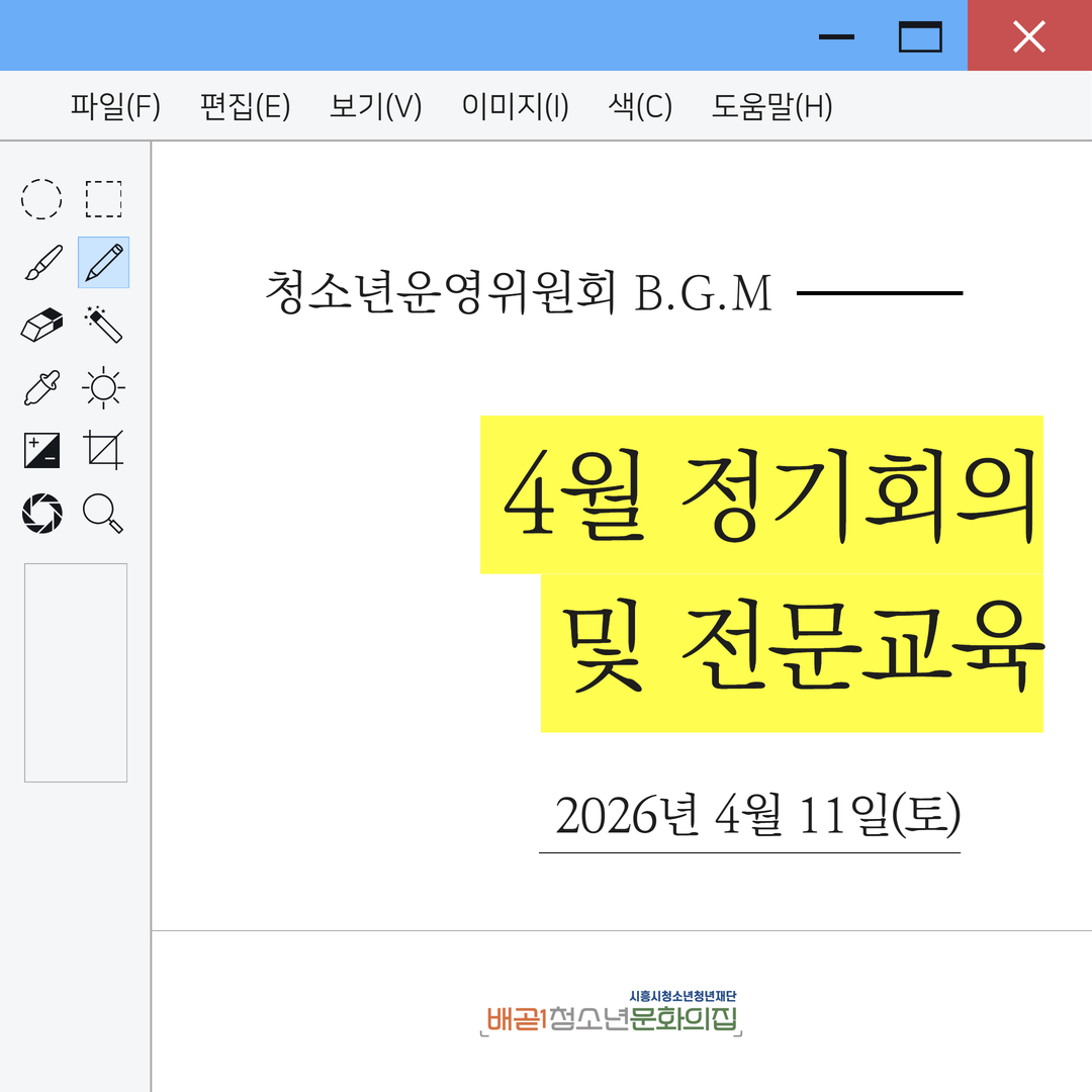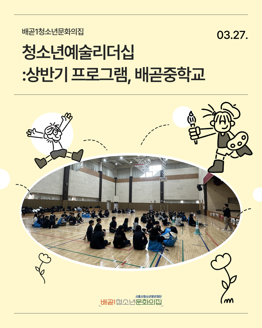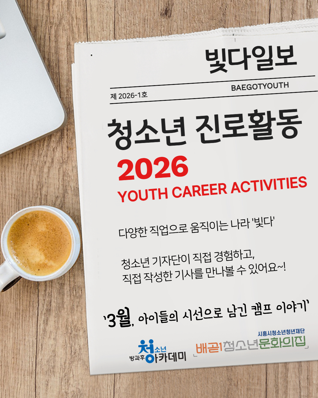사이트 전체메뉴 시설소개 인사말 기관연혁 비전 및 미션 함께하는 사람들 시설이용안내 영상정보처리기기 오시는 길 청소년참여자치활동 청소년운영위원회 'B.G.M' 청소년동아리연합회 '푸실' 청년서포터즈 '청랑' 청소년활동프로그램 시흥시청소년환경감시단 시흥시청소년환경마라톤대회 청소년예술리더십 배곧 아틀리에 모두의人테리어 청소년자율이용공간 ‘배꼬미’ 홍보 및 연계협력 방과후아카데미 ‘빛다’ 소개 프로그램 소개 프로그램 공지사항 신청&대관 통합접수예약 바로가기 흥스(대관시설) 바로가기 알림마당 공지사항 채용정보 행사안내 활동소식 보도자료 자유게시판