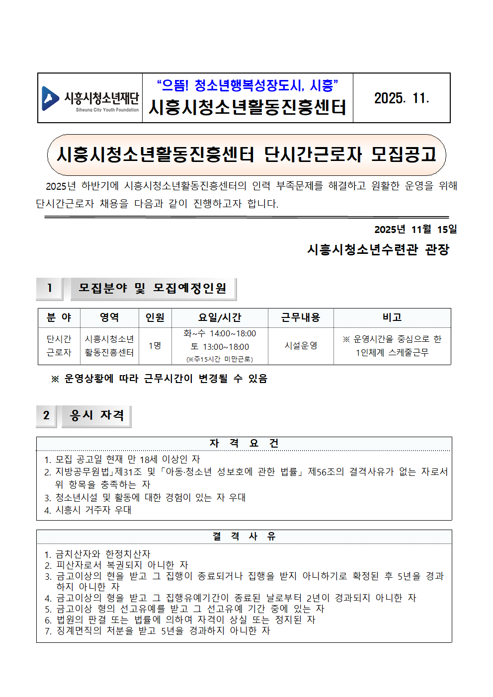 2025년 하반기 시흥시청소년활동진흥센터 단시간근로자 채용 공고(기간연장)