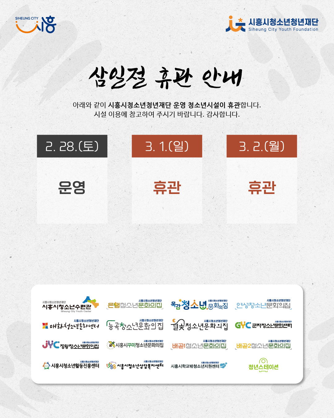 안녕하세요, 시흥시청소년청년재단 시흥시청소년활동진흥센터입니다.