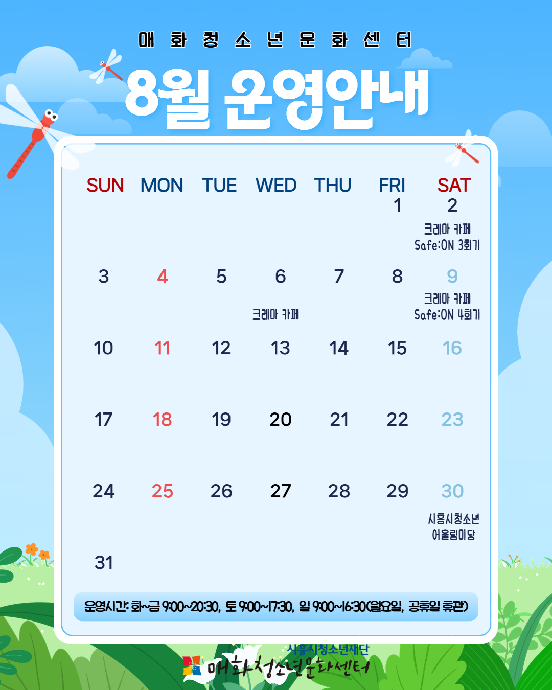 사이트 전체메뉴 시설소개 인사말 기관연혁 비전 및 미션 함께하는 사람들 시설이용안내 영상정보처리기기 오시는길 청소년참여자치활동 기관동아리연합회운영 '매아리' 특성화 사진동아리 '포커스' 특성화 바리스타동아리 '크레마' 자율동아리 활동지원 청소년활동프로그램 안전체험활동 SAFE:ON 청소년문화공간 이음PLAY 매화이음 신청&대관 통합접수예약 바로가기 흥스(대관시설) 바로가기 알림마당 공지사항 채용정보 행사안내 활동소식 보도자료 자유게시판