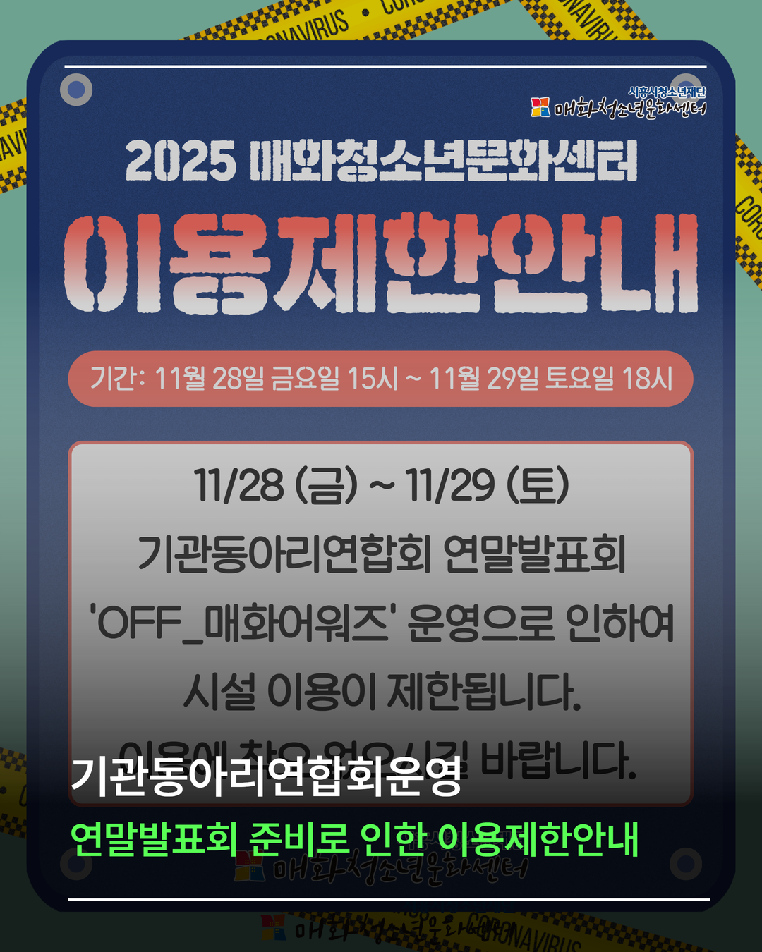 11/28 금요일 15시부터 11/29 토요일 18시까지 기관동아리연합회 연말발표회 ‘OFF_매화어워즈’ 준비 및 운영으로 인해 기관 이용이 제한됩니다.