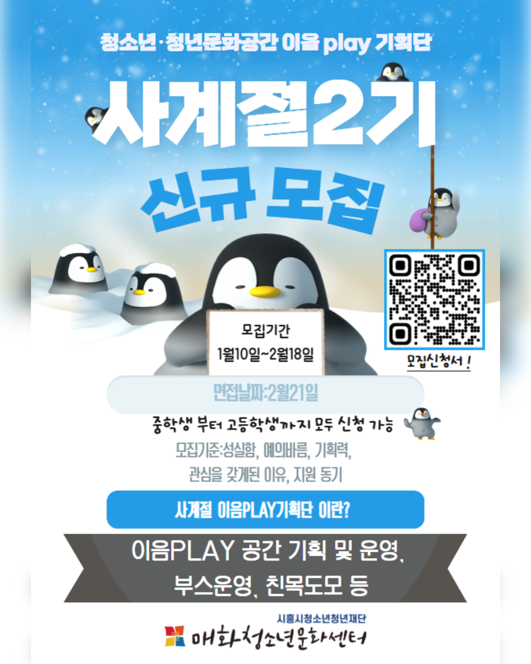 매화청소년문화센터 청소년·청년문화공간 이음PLAY기획단 사계절이 2026년 2기 신규단원을 모집합니다 !!!🔥