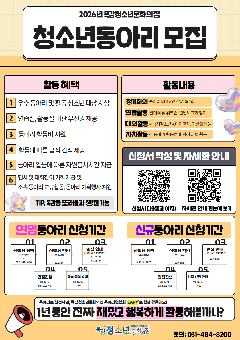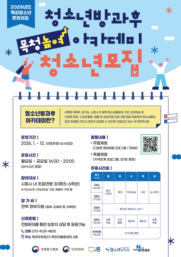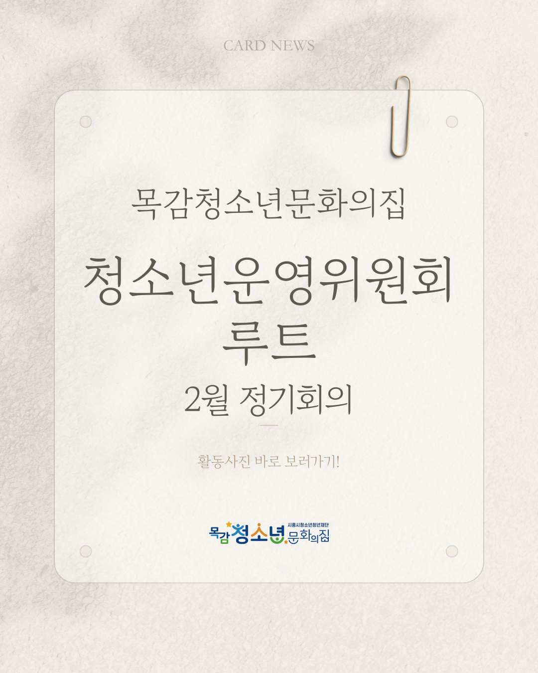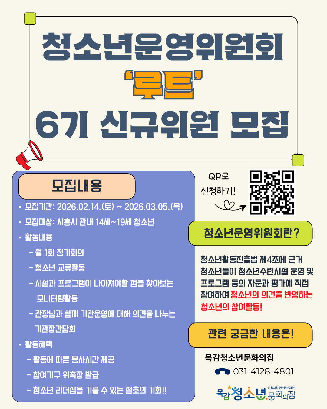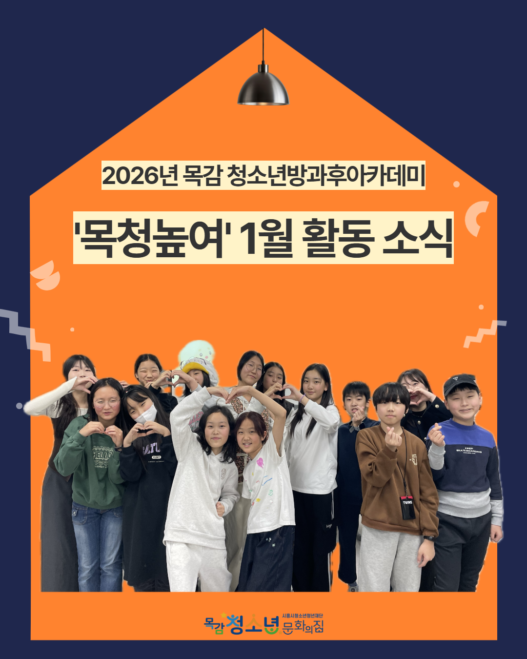 NEWS 공지사항 행사안내 보도자료 공지사항 목감청소년문화의집 2026년 3월 운영일정 안내 2026.02.28 삼일절 휴관안내 2026.02.25 🌈청소년자율공간기획단 '목공풀' 신규단원모집🌈 2026.02.21 💎 청소년운영위원회 ‘루트’ 6기 신규위원 모집 💎 2026.02.19 공지사항 더보기 행사안내 📖목청문 스터디룸 운영 안내📖 2025.11.18 "두드림"과 함께하는 스마트폰 교실 📳 ! 2025.11.15 📍도장을 목(으)자!📍 2025.11.13 🎮보드게임 토너먼트 대회 참가자 모집🎮 2025.11.07 행사안내 더보기 보도자료 목감청소년문화의집, 청소년이 만든 거리공연 '감감버스킹' 성황리 마무리 2025.11.12 시흥시 목감청소년문화의집 ‘감감 버스킹’ 성료 2024.08.29 시흥시. '제32회 시흥시청소년종합예술제' 성료 2024.06.11 시흥시, '제32회 시흥시청소년종합예술제' 참가청소년모집 2024.05.07 보도자료 더보기