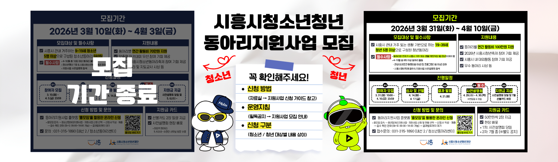 - 모집 [모집] 2026년 시흥시청소년청년동아리지원사업 "청년"동아리 모집 [모집] 2026년 시흥시청소년청년동아리지원사업 "청년"동아리 모집 2026.03.25