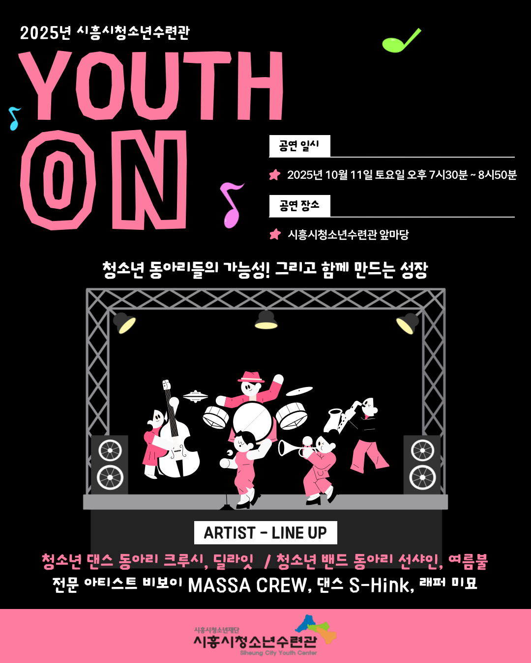 - [안내] 2025년 제10회 시흥시청소년동아리축제 공연동아리 음원 제출 안내 [안내] 2025년 제10회 시흥시청소년동아리축제 공연동아리 음원 제출 안내 2025.09.23