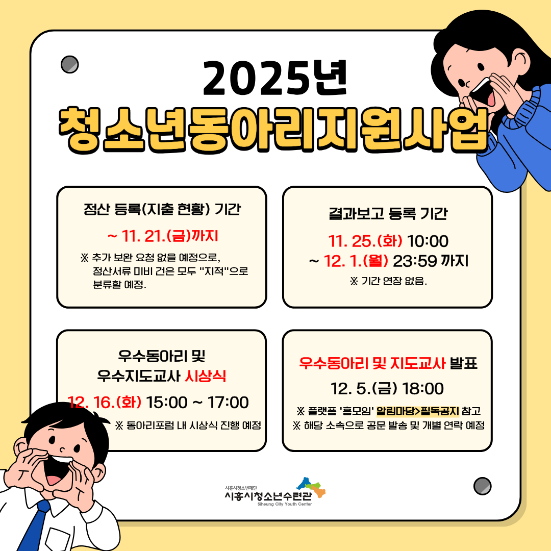 - [안내] 2025년 시흥시청소년동아리지원사업 정산 및 사업 마감 일정 안내 [안내] 2025년 시흥시청소년동아리지원사업 정산 및 사업 마감 일정 안내 2025.10.31