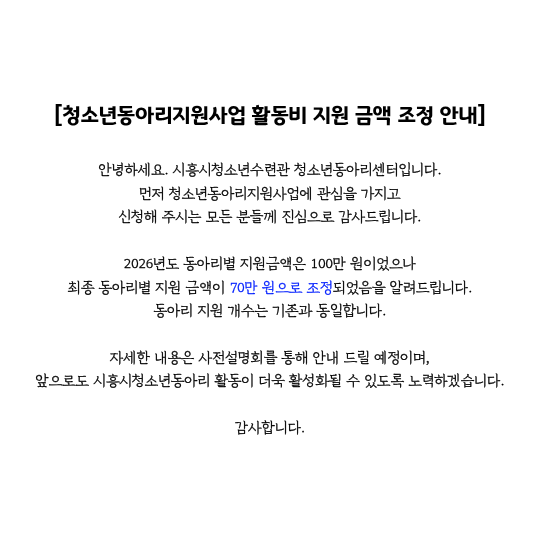 - 안내 [안내] 2025년 시흥시청소년동아리지원사업 정산 및 사업 마감 일정 안내 [안내] 2025년 시흥시청소년동아리지원사업 정산 및 사업 마감 일정 안내 2025.10.31