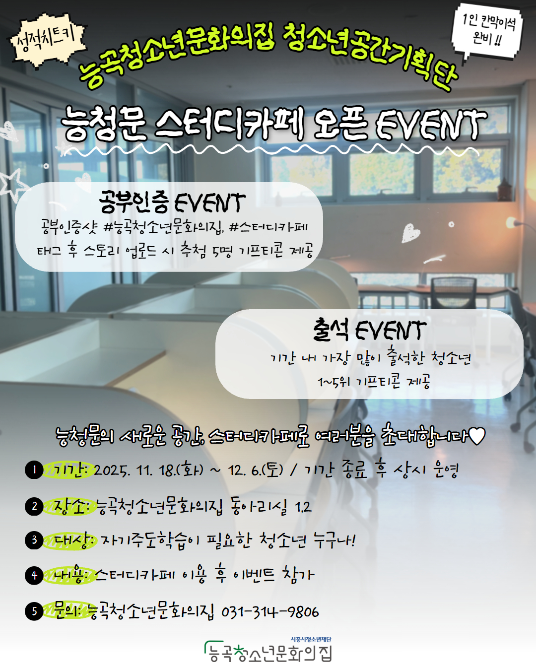 능청문의 새로운 공간, 스터디카페로 여러분을 초대합니다 💚