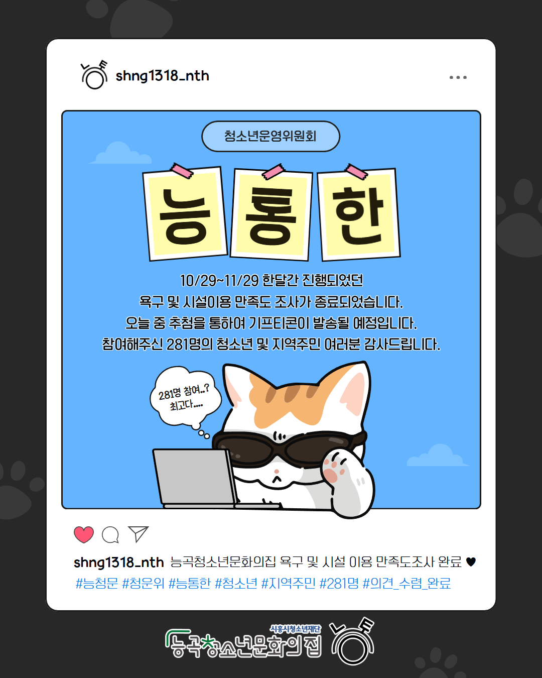 사이트 전체메뉴 시설소개 인사말 기관연혁 비전 및 미션 함께하는 사람들 시설이용안내 영상정보처리기기 오시는 길 청소년참여자치활동 청소년 참여자치기구 연합지원사업 청소년운영위원회 ‘능통한’ 청소년동아리연합회 ‘아로하’ 후기청소년서포터즈 ‘로망’ 기관특성화동아리 청소년활동프로그램 후기 청소년 체험형 인턴십 프로그램 SDGs청소년사회참여프로젝트 능곡미디어스튜디오 능곡베이킹스튜디오 사회참여환경프로그램 청소년AR실내운동회·플랫폼 청소년바리스타활동 청소년자율이용공간 청소년주도공간기획운영 청소년참여역량강화활동 지역사회연계협력활동 신청&대관 통합예약접수 바로가기 흥스(대관시설) 바로가기 알림마당 공지사항 채용정보 행사안내 활동소식 보도자료 자유게시판