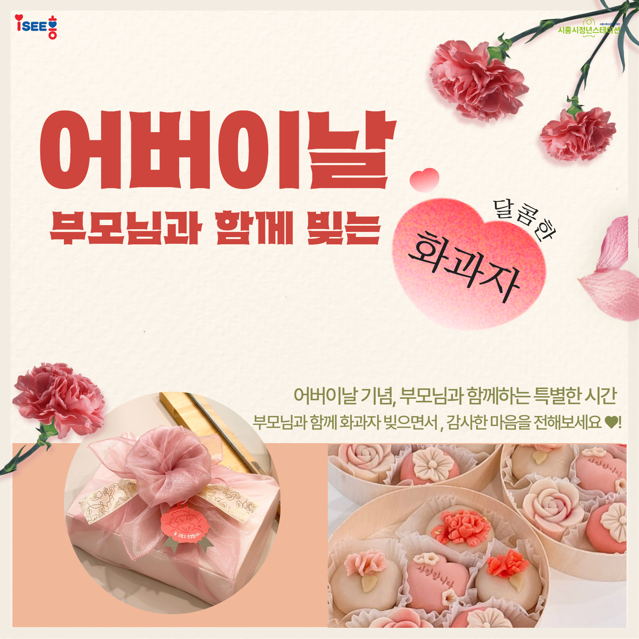 🔖모집기간 : 4/24(금) 17:00 ~ 선착순 모집 🙋🏻♂모집인원 : 20명 (청년 10명 + 부모님 중 1인 동반 = 2인 1조) 📌참가비용 : 무료 🎁 준비물 : 부모님과 함께 즐길 마음...★ 🏠진행장소 : 청년스테이션 소담키친 🧸신청대상 - (필수) 시흥시에 거주하거나 생활기반을 둔 19세 ~ 39세 청년 - 어버이날을 기념하여 부모님과 특별한 추억을 만들고 싶은 청년 - 부모님과 함께 화과자 만들고 싶은 청년 - 어버이날 기념하고 싶은 청년
