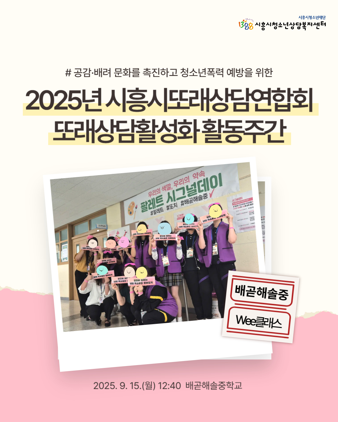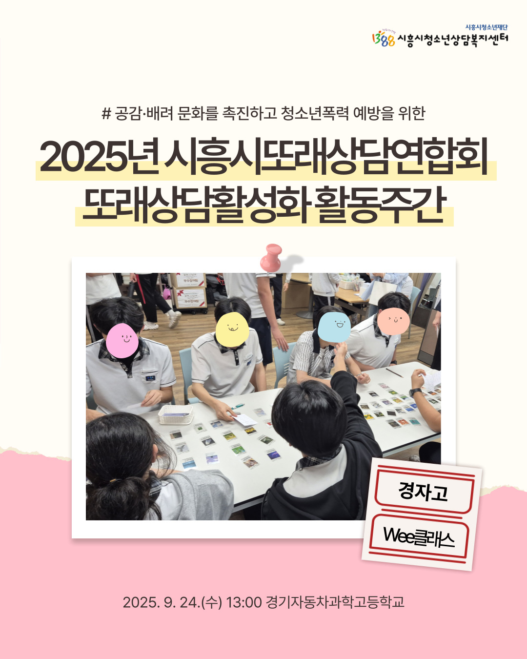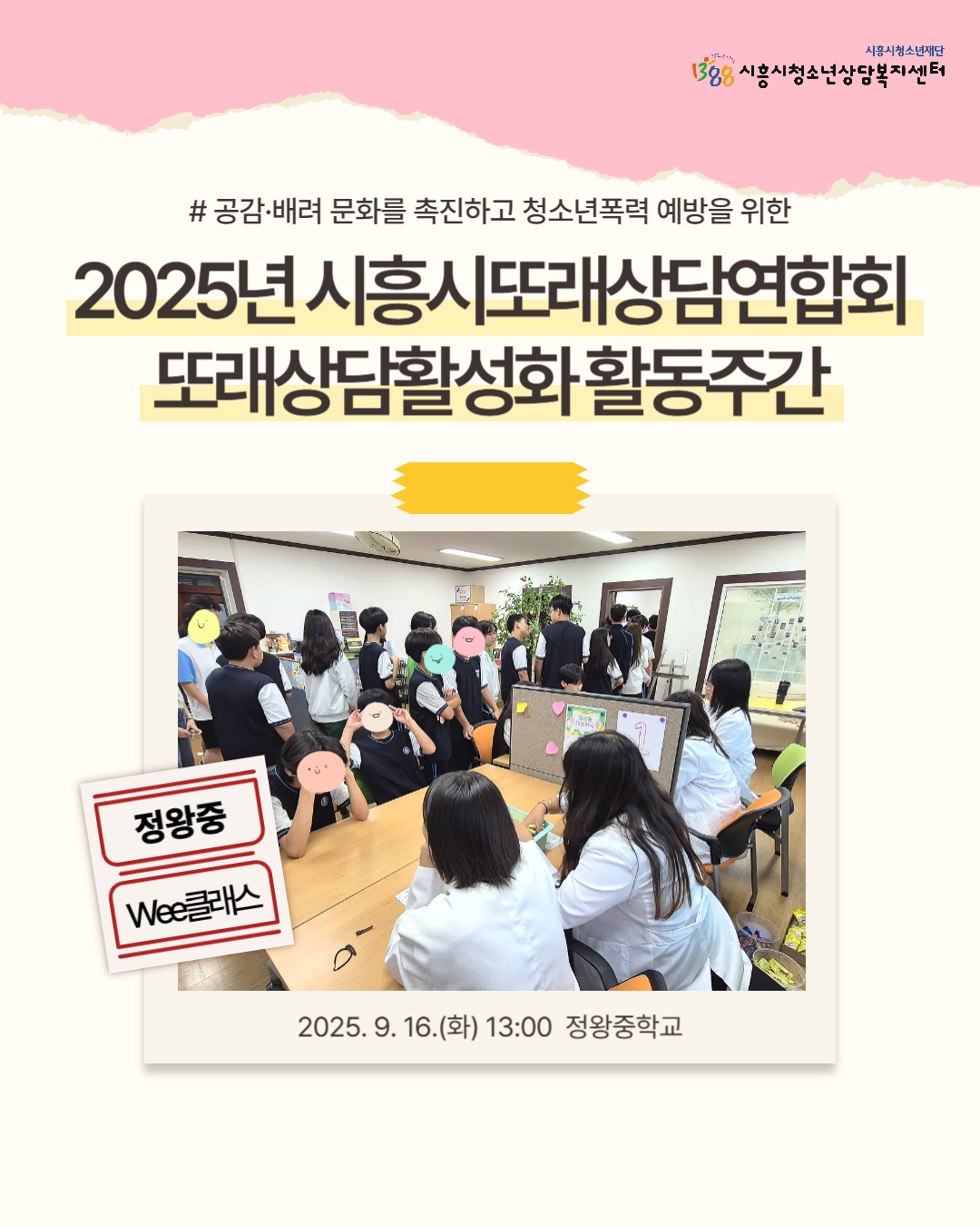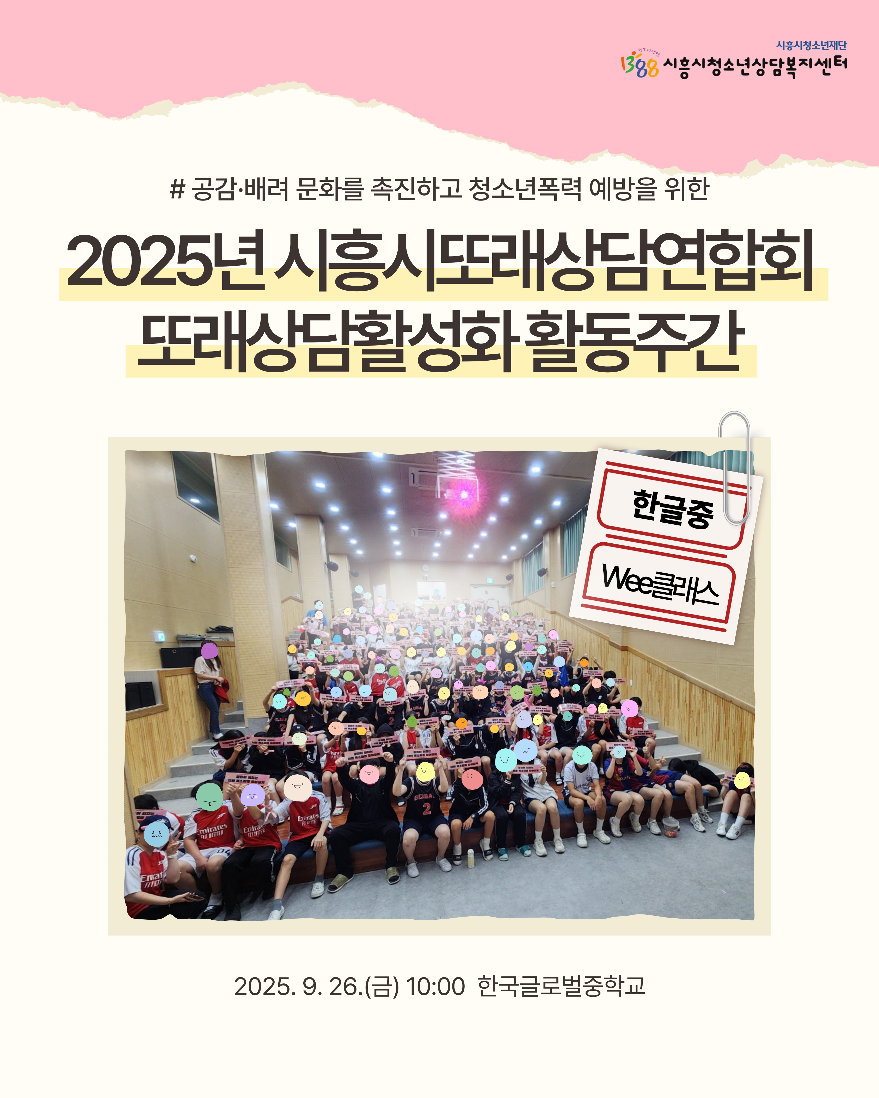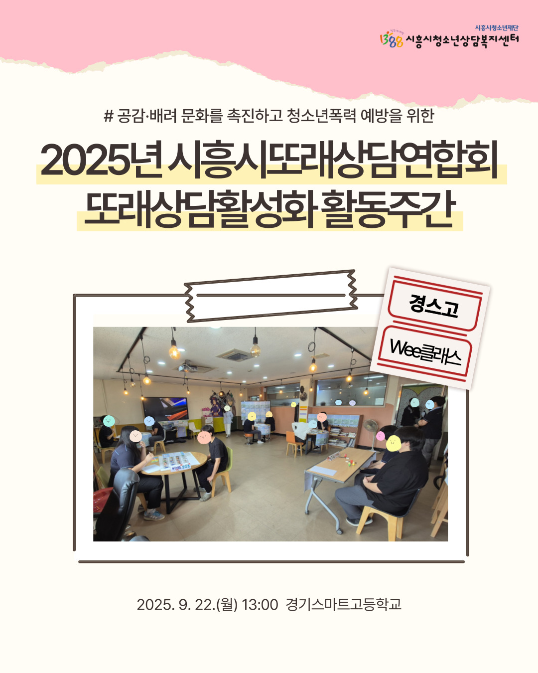 사이트 전체메뉴 시설소개 인사말 기관연혁 비전 및 미션 함께하는 사람들 시설이용안내 영상정보처리기기 오시는길 사업소개 개인상담 및 심리검사 청소년1388 청소년안전망 청소년동반자 프로그램 교육프로그램 또래상담활성화사업 미디어 과의존 예방해소사업 온라인상담 사이버 상담신청 신청&대관 통합예약접수 바로가기 흥스(대관시설) 바로가기 알림마당 공지사항 채용정보 활동소식 보도자료