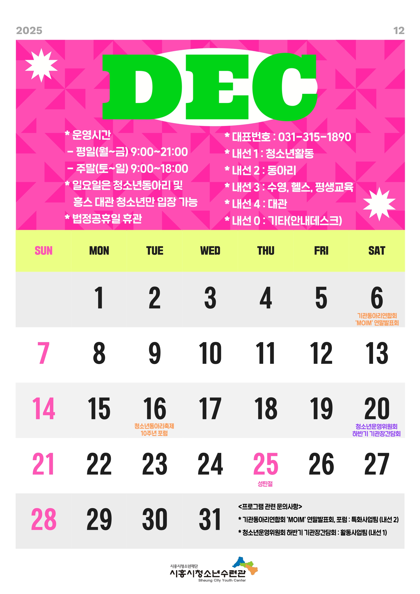 사이트 전체메뉴 시설소개 인사말 기관연혁 비전 및 미션 함께하는 사람들 시설이용안내 영상정보처리기기 오시는길 청소년참여자치활동 청소년운영위원회 ‘징검다리’ 기관동아리연합회 ‘MOIM’ 후기청소년서포터즈 ‘청춘동행’ 청소년활동프로그램 시흥시으뜸성장챌린지 시흥시청소년동아리지원사업 시흥시청소년동아리축제 창업프로그램 시흥시청소년어울림마당 썸머에피소드 문화체육프로그램 수영 헬스 평생교육(문화교육, 생활체육) 신청&대관 정규강좌수강신청 통합접수예약 바로가기 흥스(대관시설) 바로가기 알림마당 공지사항 채용정보 행사안내 활동소식 보도자료 자유게시판