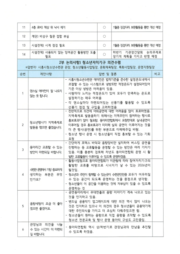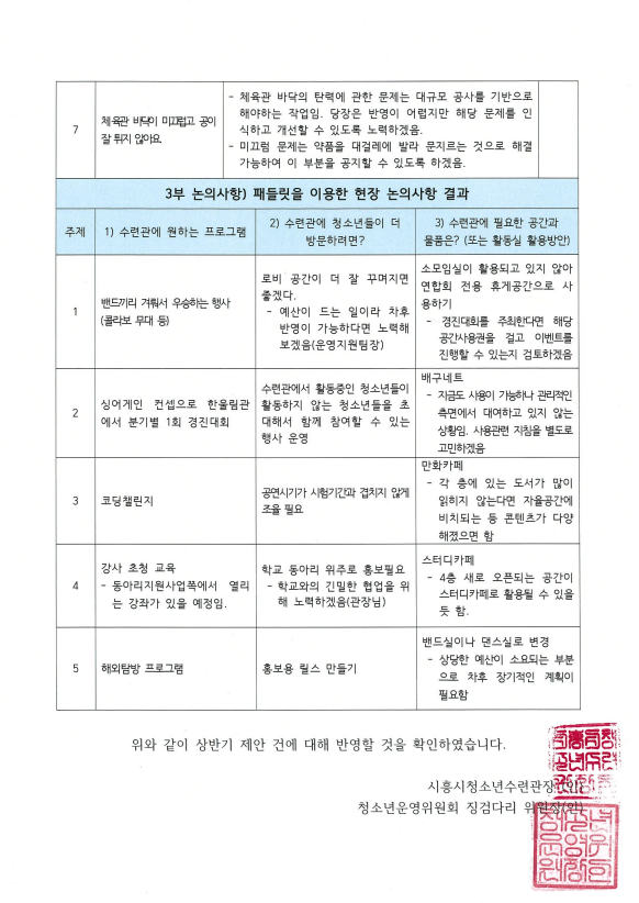 사이트 전체메뉴 시설소개 인사말 기관연혁 비전 및 미션 함께하는 사람들 시설이용안내 영상정보처리기기 오시는길 청소년참여자치활동 청소년운영위원회 ‘징검다리’ 기관동아리연합회 ‘MOIM’ 후기청소년서포터즈 ‘청춘동행’ 청소년활동프로그램 시흥시으뜸성장챌린지 시흥시청소년동아리지원사업 시흥시청소년동아리축제 창업프로그램 시흥시청소년어울림마당 썸머에피소드 문화체육프로그램 수영 헬스 평생교육(문화교육, 생활체육) 신청&대관 정규강좌수강신청 통합접수예약 바로가기 흥스(대관시설) 바로가기 알림마당 공지사항 채용정보 행사안내 활동소식 보도자료 자유게시판