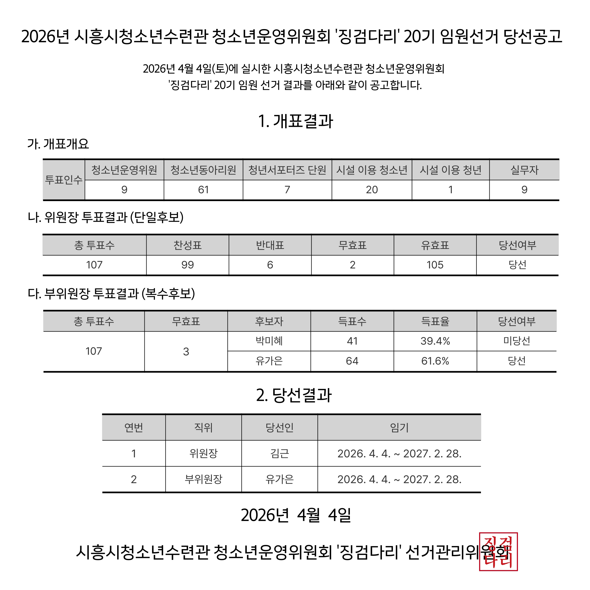 📢 시.청.수 청소년운영위원회 ‘징검다리’ 임원선거 결과 안내