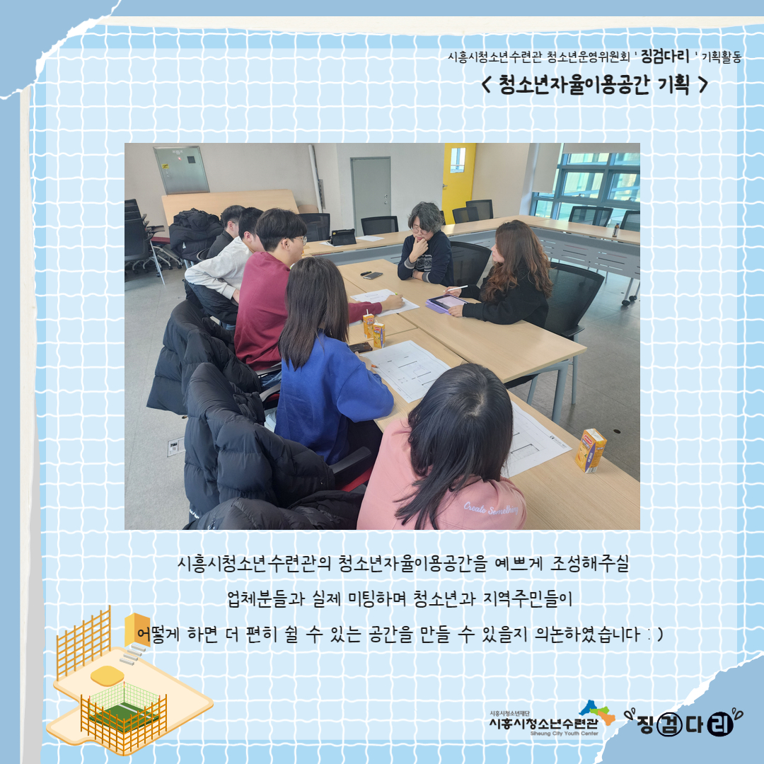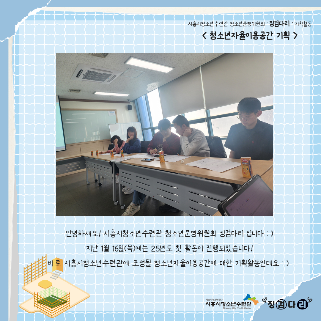 사이트 전체메뉴 시설소개 인사말 기관연혁 비전 및 미션 함께하는 사람들 시설이용안내 영상정보처리기기 오시는길 청소년참여자치활동 청소년운영위원회 ‘징검다리’ 기관동아리연합회 ‘MOIM’ 후기청소년서포터즈 ‘청춘동행’ 청소년활동프로그램 시흥시으뜸성장챌린지 시흥시청소년동아리지원사업 시흥시청소년동아리축제 창업프로그램 시흥시청소년어울림마당 썸머에피소드 문화체육프로그램 수영 헬스 평생교육(문화교육, 생활체육) 신청&대관 정규강좌수강신청 통합접수예약 바로가기 흥스(대관시설) 바로가기 알림마당 공지사항 채용정보 행사안내 활동소식 보도자료 자유게시판