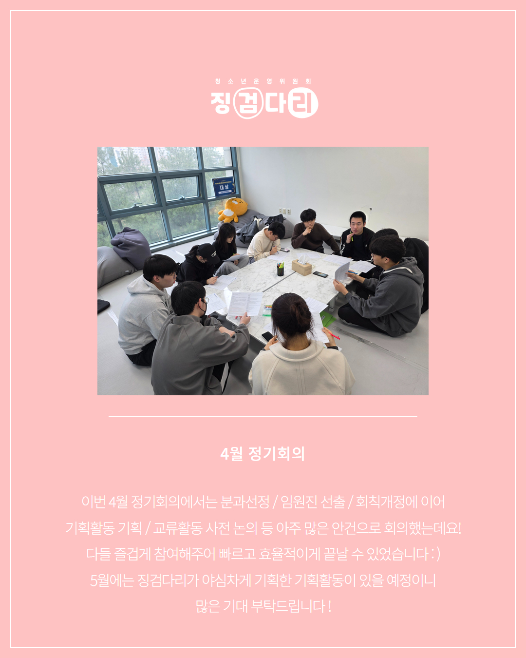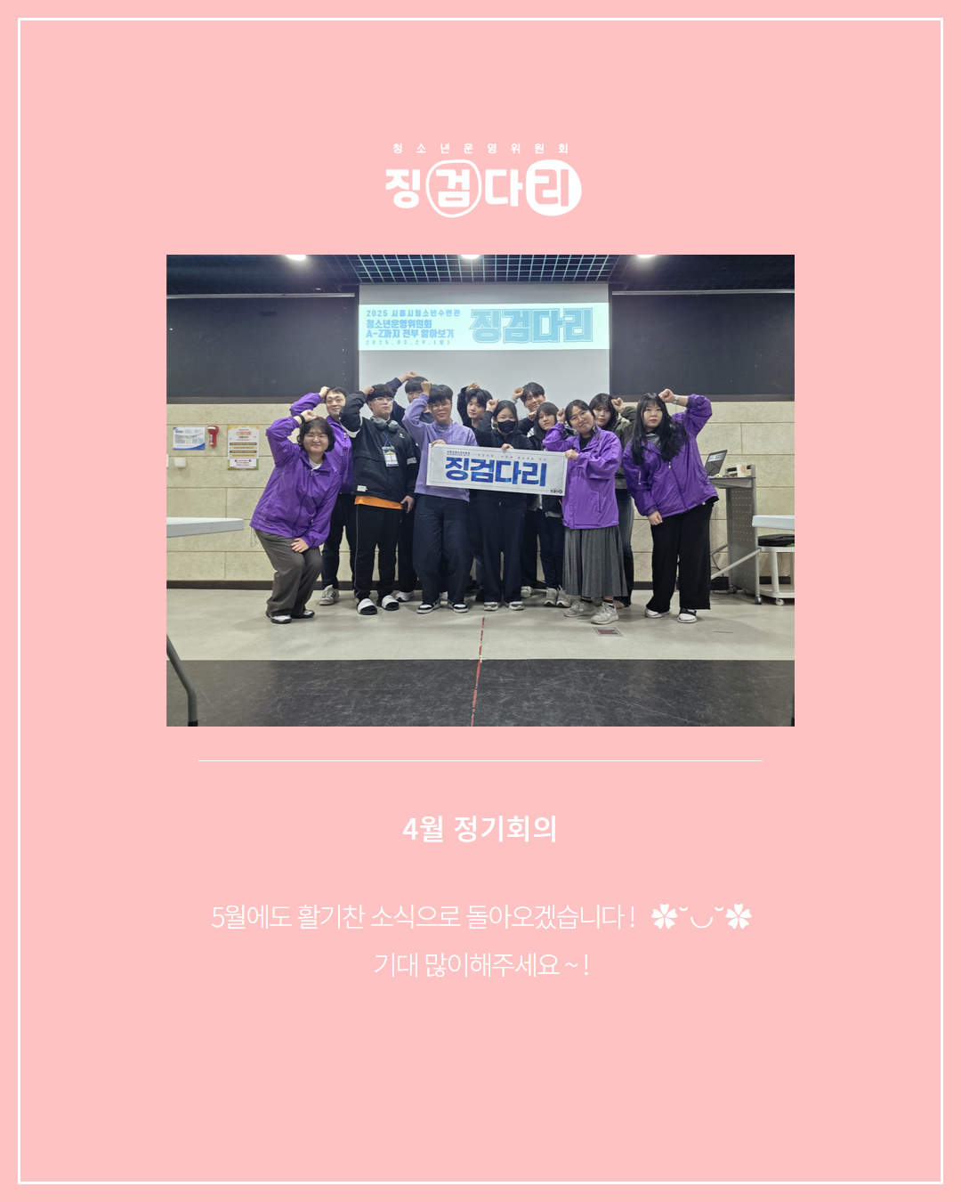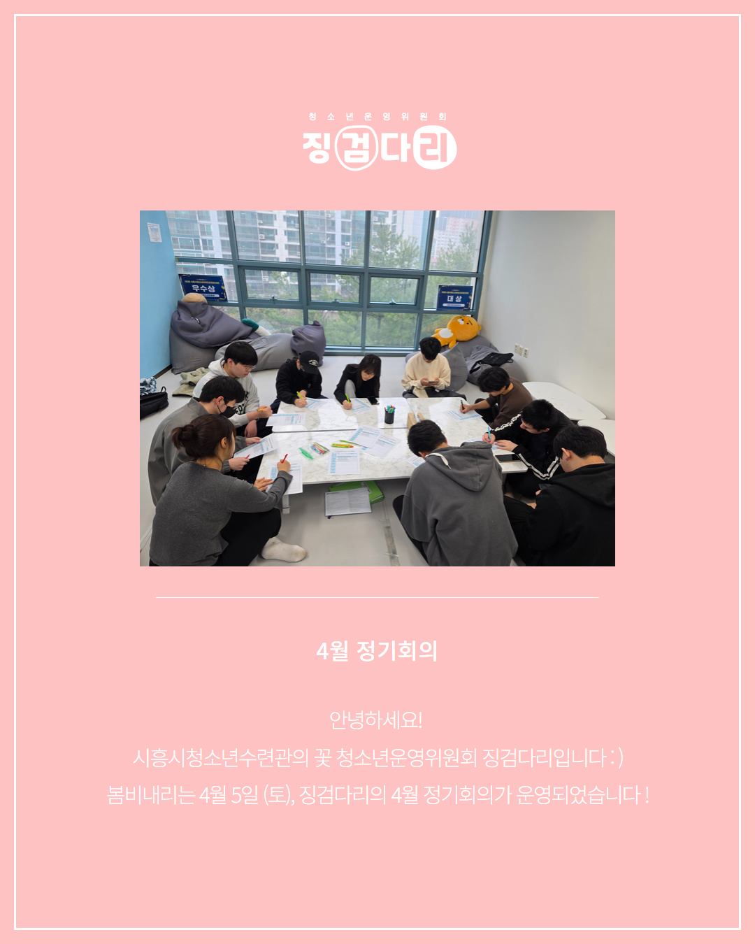 사이트 전체메뉴 시설소개 인사말 기관연혁 비전 및 미션 함께하는 사람들 시설이용안내 영상정보처리기기 오시는길 청소년참여자치활동 청소년운영위원회 ‘징검다리’ 기관동아리연합회 ‘MOIM’ 후기청소년서포터즈 ‘청춘동행’ 청소년활동프로그램 시흥시으뜸성장챌린지 시흥시청소년동아리지원사업 시흥시청소년동아리축제 창업프로그램 시흥시청소년어울림마당 썸머에피소드 문화체육프로그램 수영 헬스 평생교육(문화교육, 생활체육) 신청&대관 정규강좌수강신청 통합접수예약 바로가기 흥스(대관시설) 바로가기 알림마당 공지사항 채용정보 행사안내 활동소식 보도자료 자유게시판