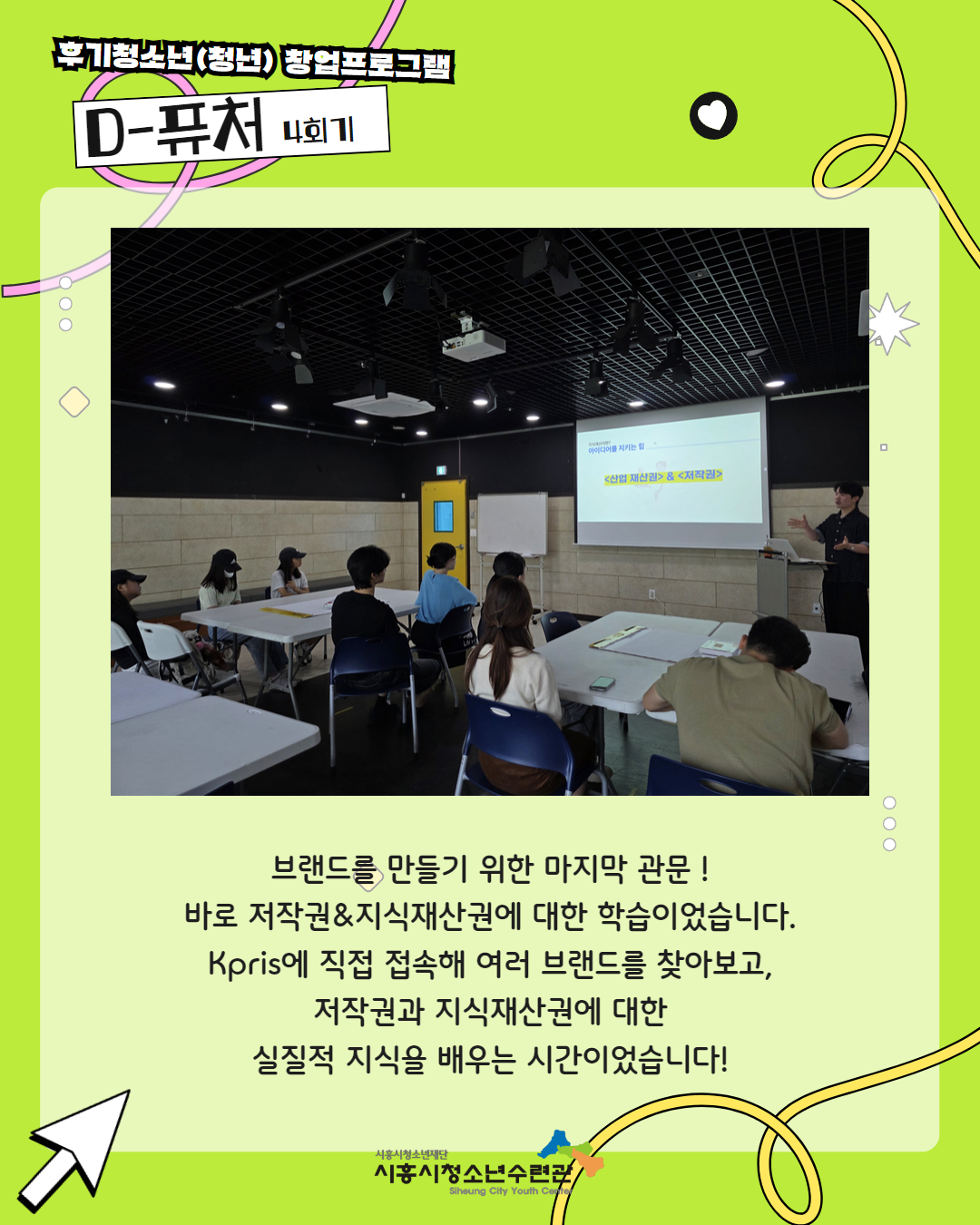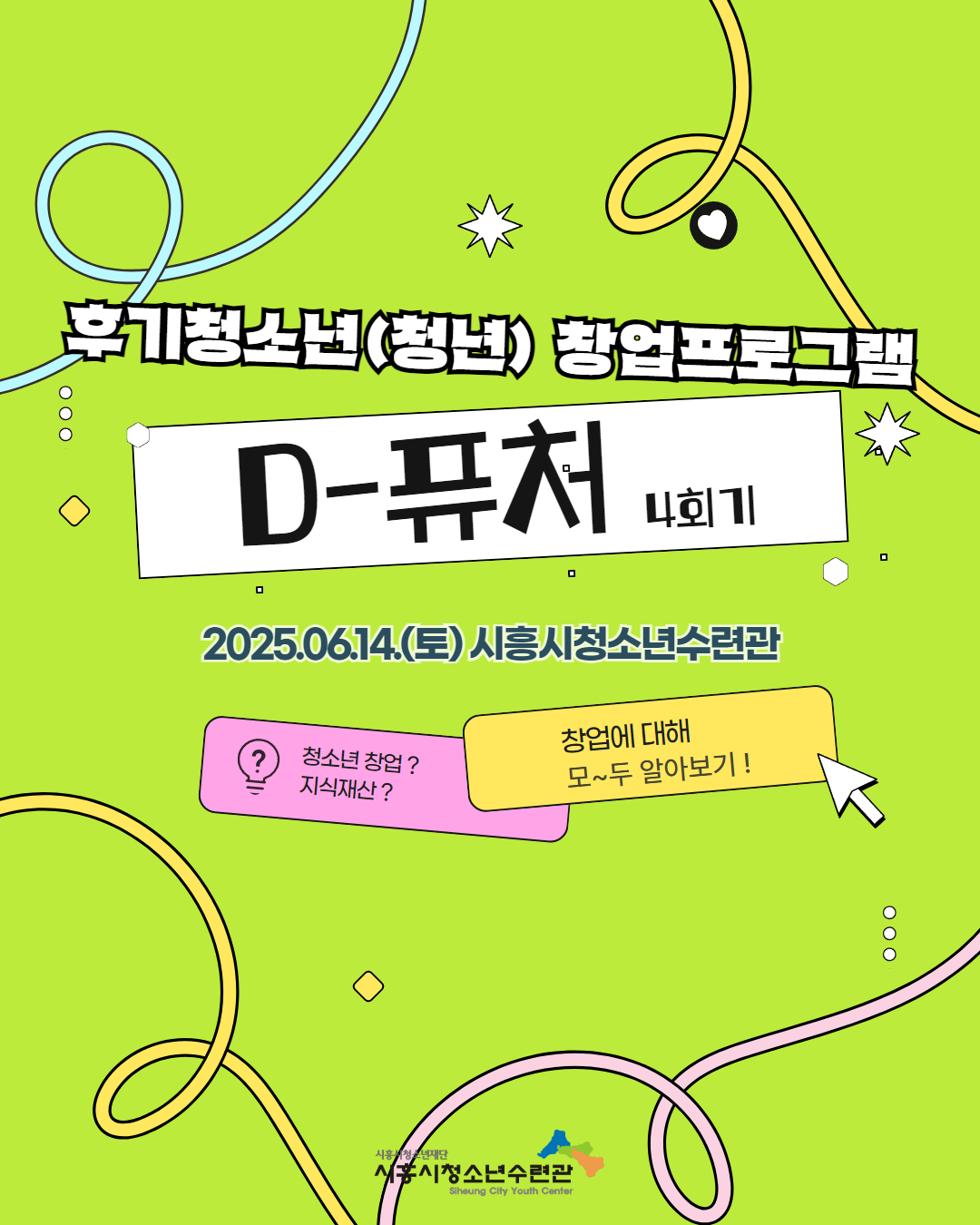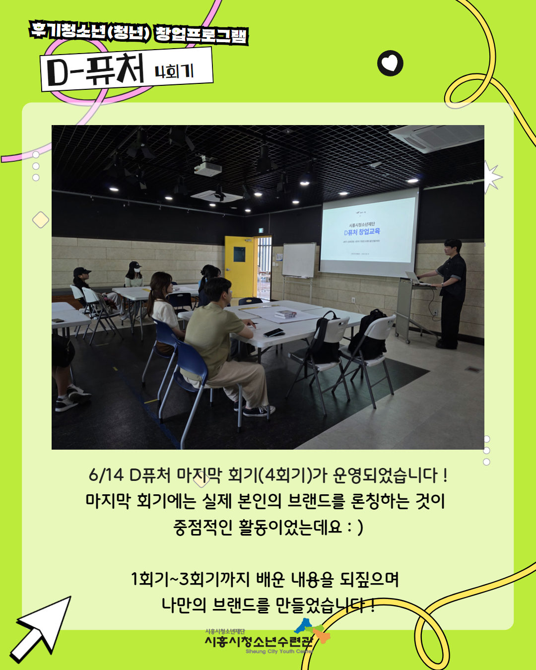 사이트 전체메뉴 시설소개 인사말 기관연혁 비전 및 미션 함께하는 사람들 시설이용안내 영상정보처리기기 오시는길 청소년참여자치활동 청소년운영위원회 ‘징검다리’ 기관동아리연합회 ‘MOIM’ 후기청소년서포터즈 ‘청춘동행’ 청소년활동프로그램 시흥시으뜸성장챌린지 시흥시청소년동아리지원사업 시흥시청소년동아리축제 창업프로그램 시흥시청소년어울림마당 썸머에피소드 문화체육프로그램 수영 헬스 평생교육(문화교육, 생활체육) 신청&대관 정규강좌수강신청 통합접수예약 바로가기 흥스(대관시설) 바로가기 알림마당 공지사항 채용정보 행사안내 활동소식 보도자료 자유게시판