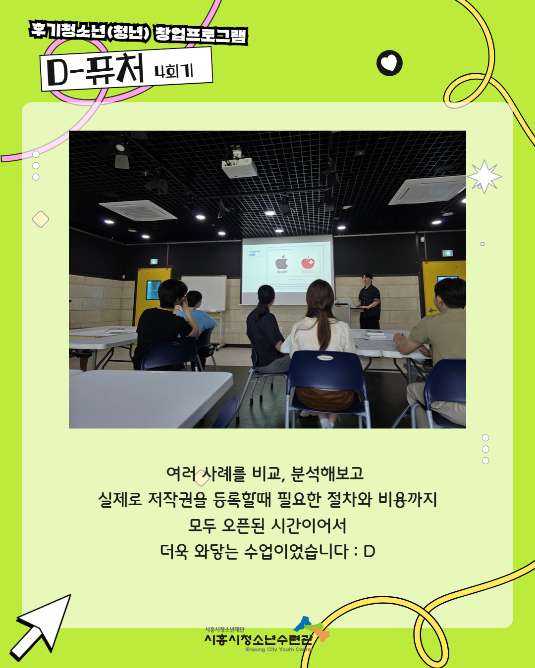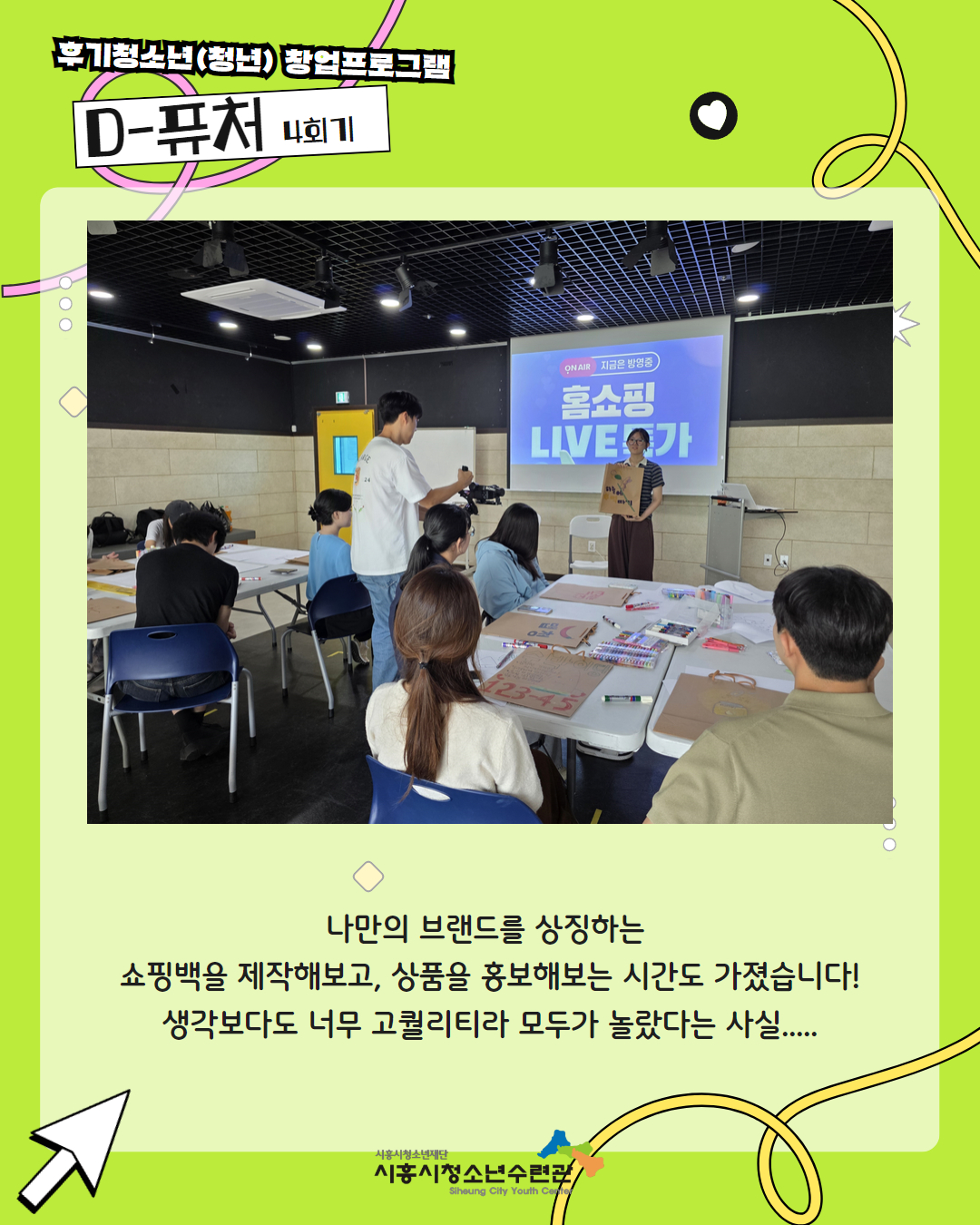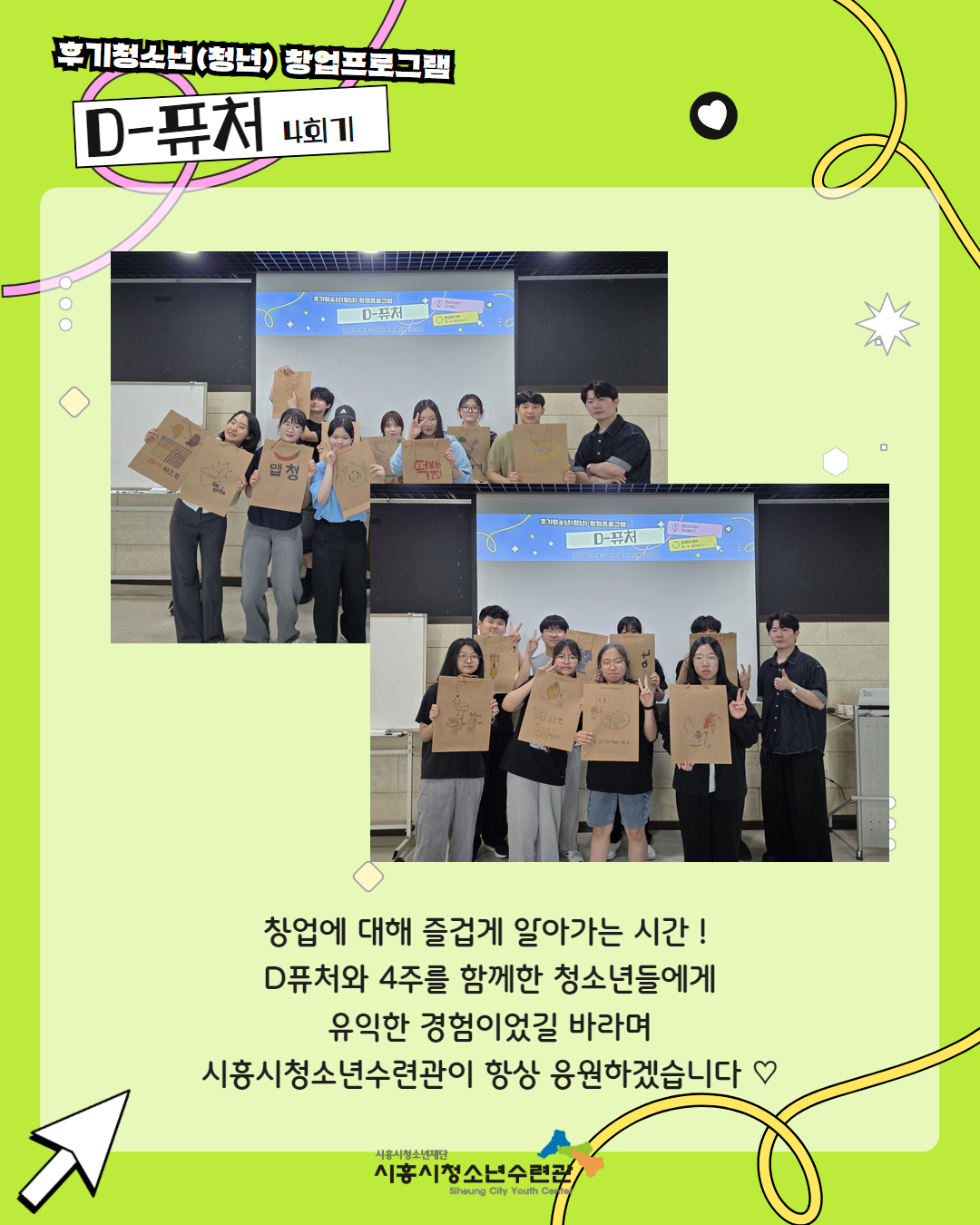 사이트 전체메뉴 시설소개 인사말 기관연혁 비전 및 미션 함께하는 사람들 시설이용안내 영상정보처리기기 오시는길 청소년참여자치활동 청소년운영위원회 ‘징검다리’ 기관동아리연합회 ‘MOIM’ 후기청소년서포터즈 ‘청춘동행’ 청소년활동프로그램 시흥시으뜸성장챌린지 시흥시청소년동아리지원사업 시흥시청소년동아리축제 창업프로그램 시흥시청소년어울림마당 썸머에피소드 문화체육프로그램 수영 헬스 평생교육(문화교육, 생활체육) 신청&대관 정규강좌수강신청 통합접수예약 바로가기 흥스(대관시설) 바로가기 알림마당 공지사항 채용정보 행사안내 활동소식 보도자료 자유게시판