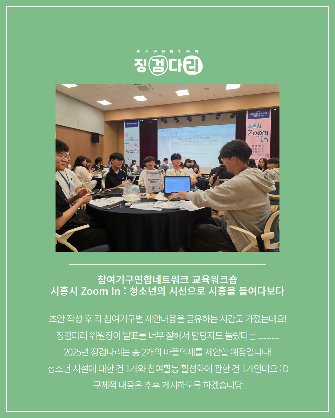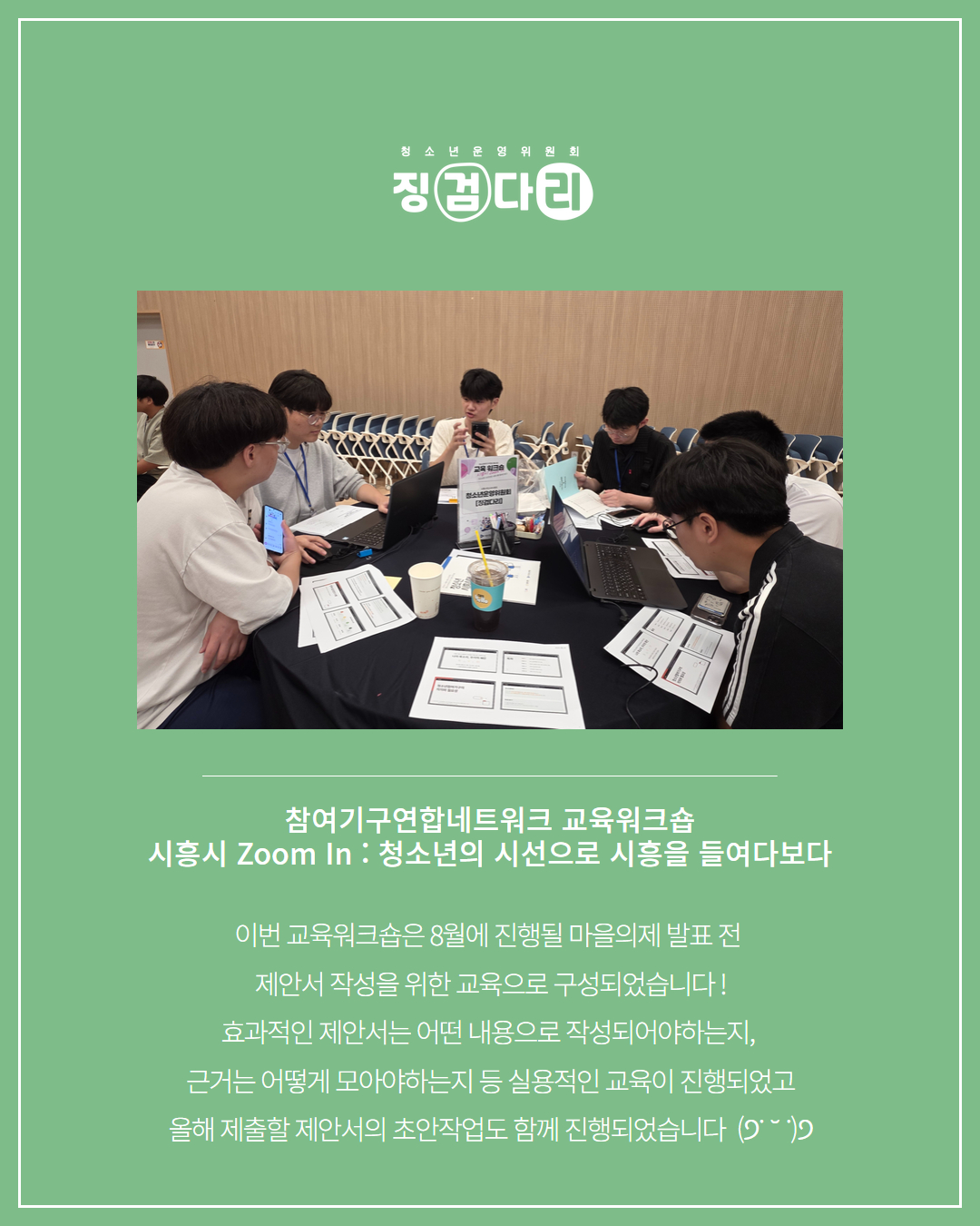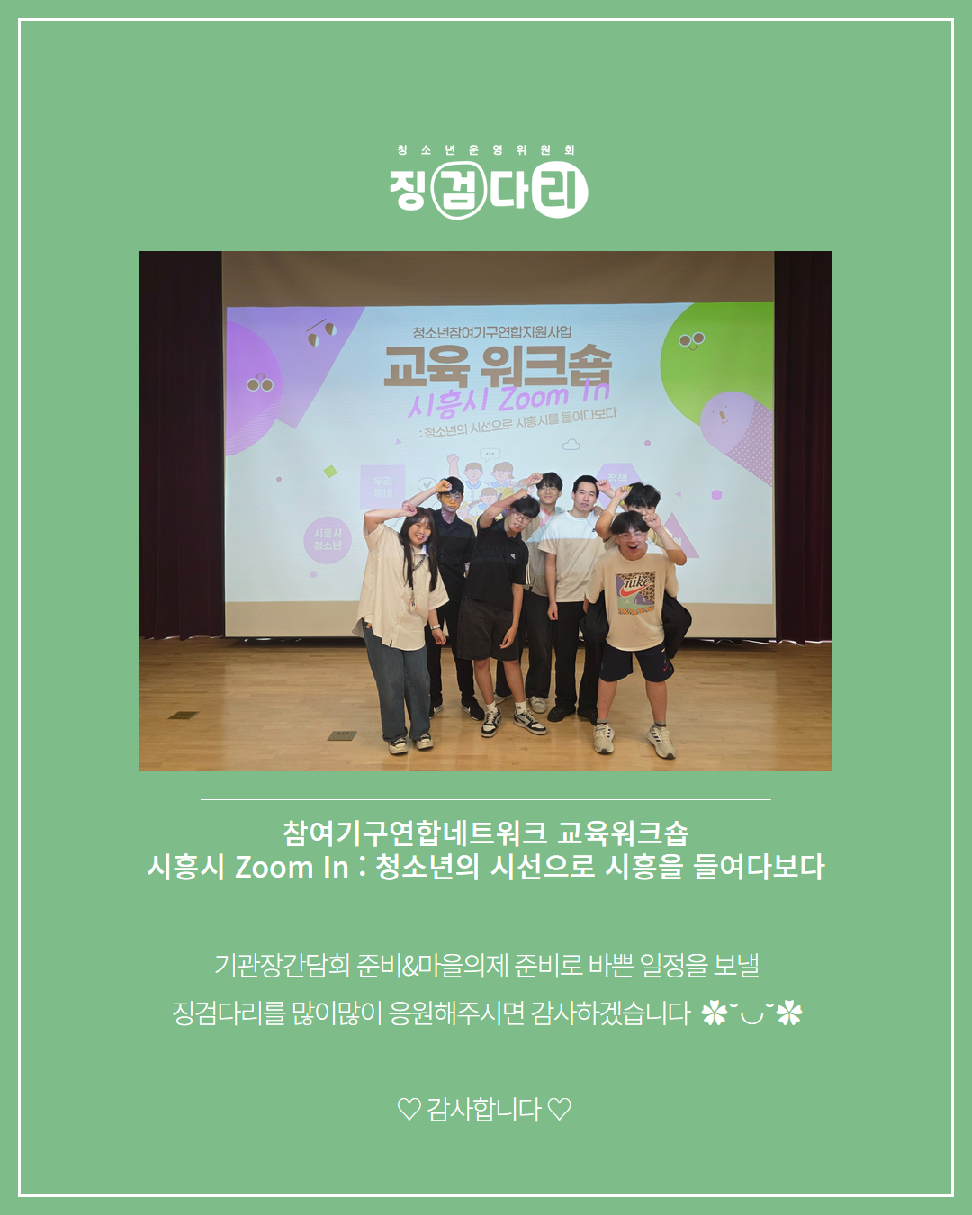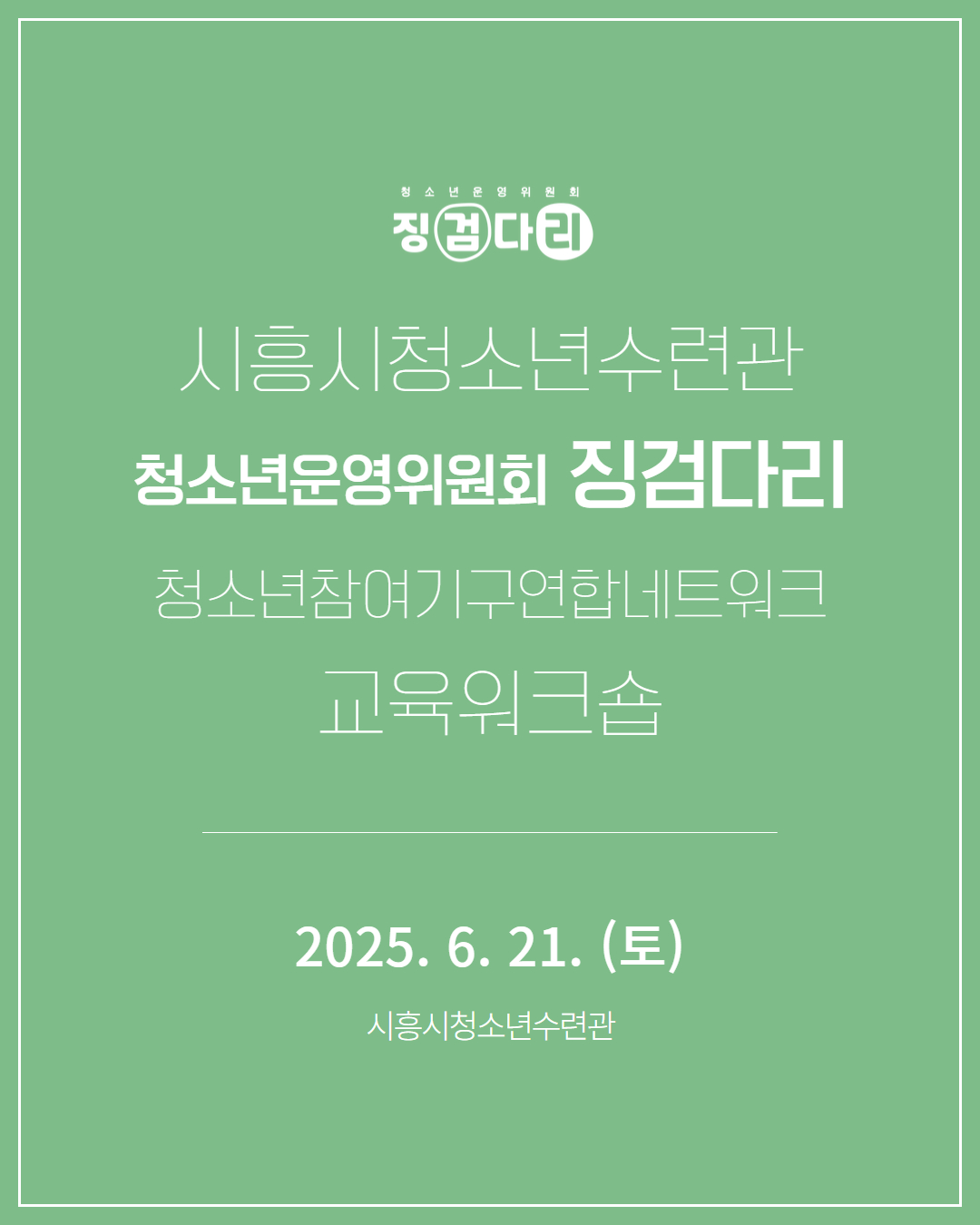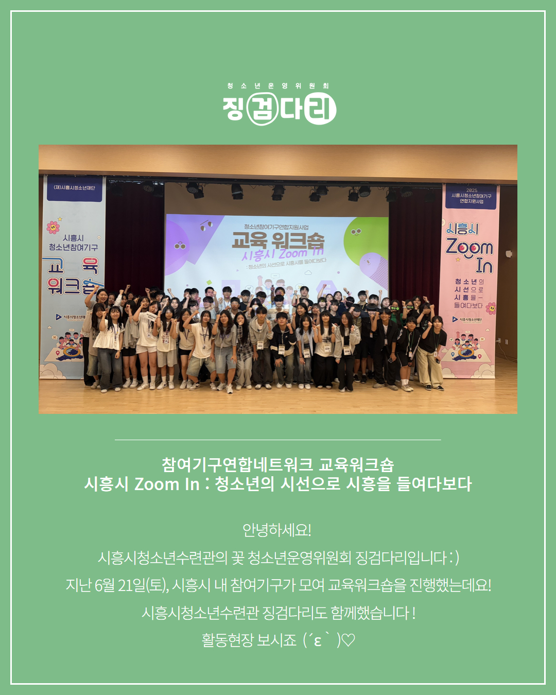 사이트 전체메뉴 시설소개 인사말 기관연혁 비전 및 미션 함께하는 사람들 시설이용안내 영상정보처리기기 오시는길 청소년참여자치활동 청소년운영위원회 ‘징검다리’ 기관동아리연합회 ‘MOIM’ 후기청소년서포터즈 ‘청춘동행’ 청소년활동프로그램 시흥시으뜸성장챌린지 시흥시청소년동아리지원사업 시흥시청소년동아리축제 창업프로그램 시흥시청소년어울림마당 썸머에피소드 문화체육프로그램 수영 헬스 평생교육(문화교육, 생활체육) 신청&대관 정규강좌수강신청 통합접수예약 바로가기 흥스(대관시설) 바로가기 알림마당 공지사항 채용정보 행사안내 활동소식 보도자료 자유게시판