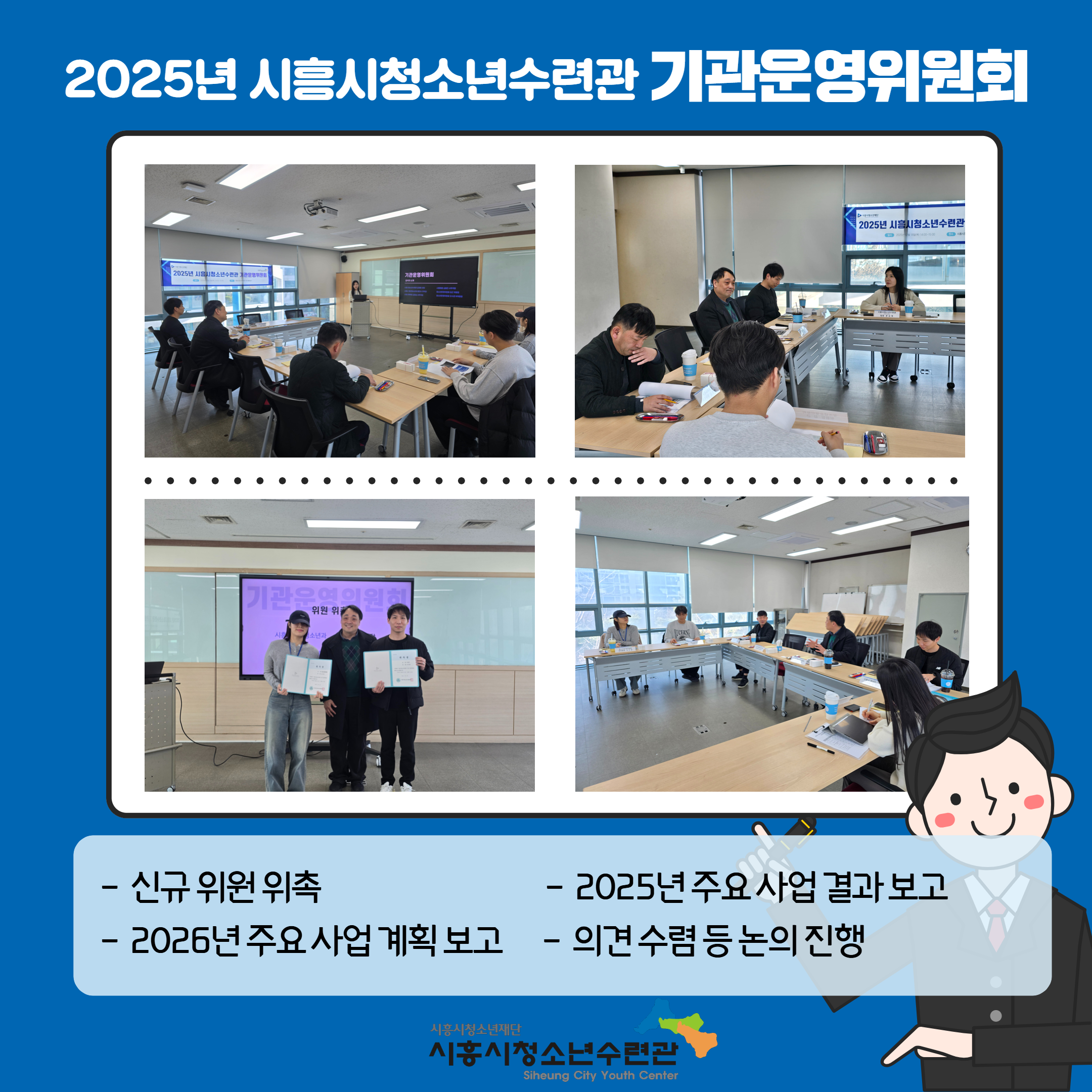 사이트 전체메뉴 시설소개 인사말 기관연혁 비전 및 미션 함께하는 사람들 시설이용안내 영상정보처리기기 오시는길 청소년참여자치활동 청소년운영위원회 ‘징검다리’ 기관동아리연합회 ‘MOIM’ 후기청소년서포터즈 ‘청춘동행’ 청소년활동프로그램 시흥시으뜸성장챌린지 시흥시청소년동아리지원사업 시흥시청소년동아리축제 창업프로그램 시흥시청소년어울림마당 썸머에피소드 문화체육프로그램 수영 헬스 평생교육(문화교육, 생활체육) 신청&대관 정규강좌수강신청 통합접수예약 바로가기 흥스(대관시설) 바로가기 알림마당 공지사항 채용정보 행사안내 활동소식 보도자료 자유게시판