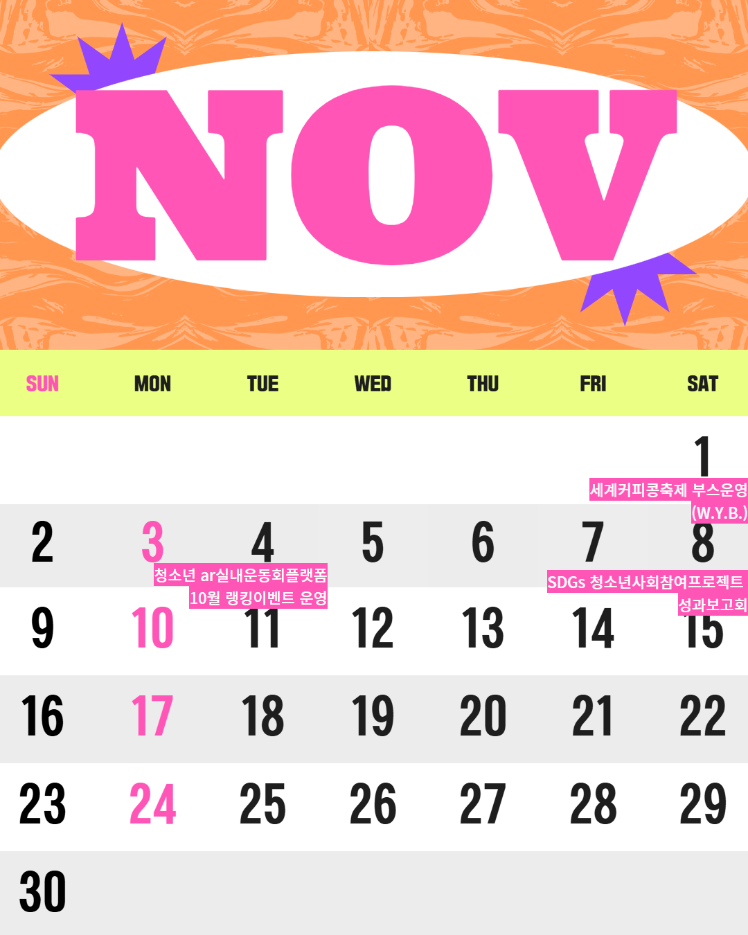 11월의 군청문은 SDGs 청소년사회참여프로젝트 성과보고회를 비롯하여 AR 실내운동회플랫폼 이벤트가 진행될 예정인데요~!