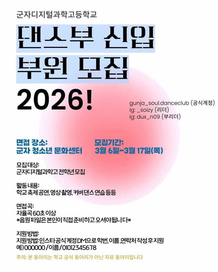 [안내] 군자청소년문화센터 댄스동아리 소울 신규동아리원 모집