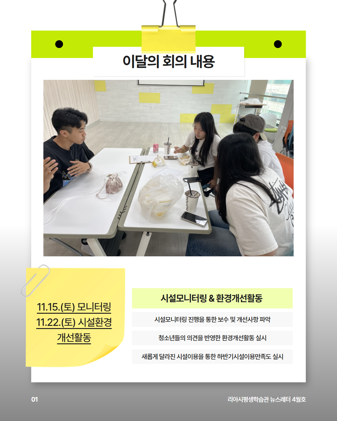 이번 11월 정기회의에서는 시설모니터링 & 환경개선활동을 안건으로 회의를 진행했습니다.