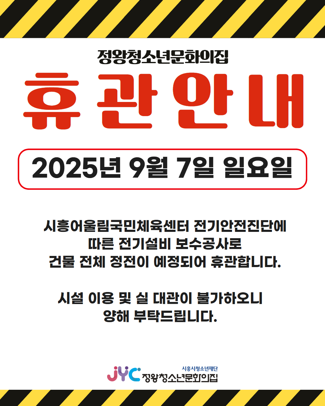 시흥어울림국민체육센터 전기설비 보수공사로 건물 전체 정전이 예정되어 정왕청소년문화의집은 휴관합니다.
