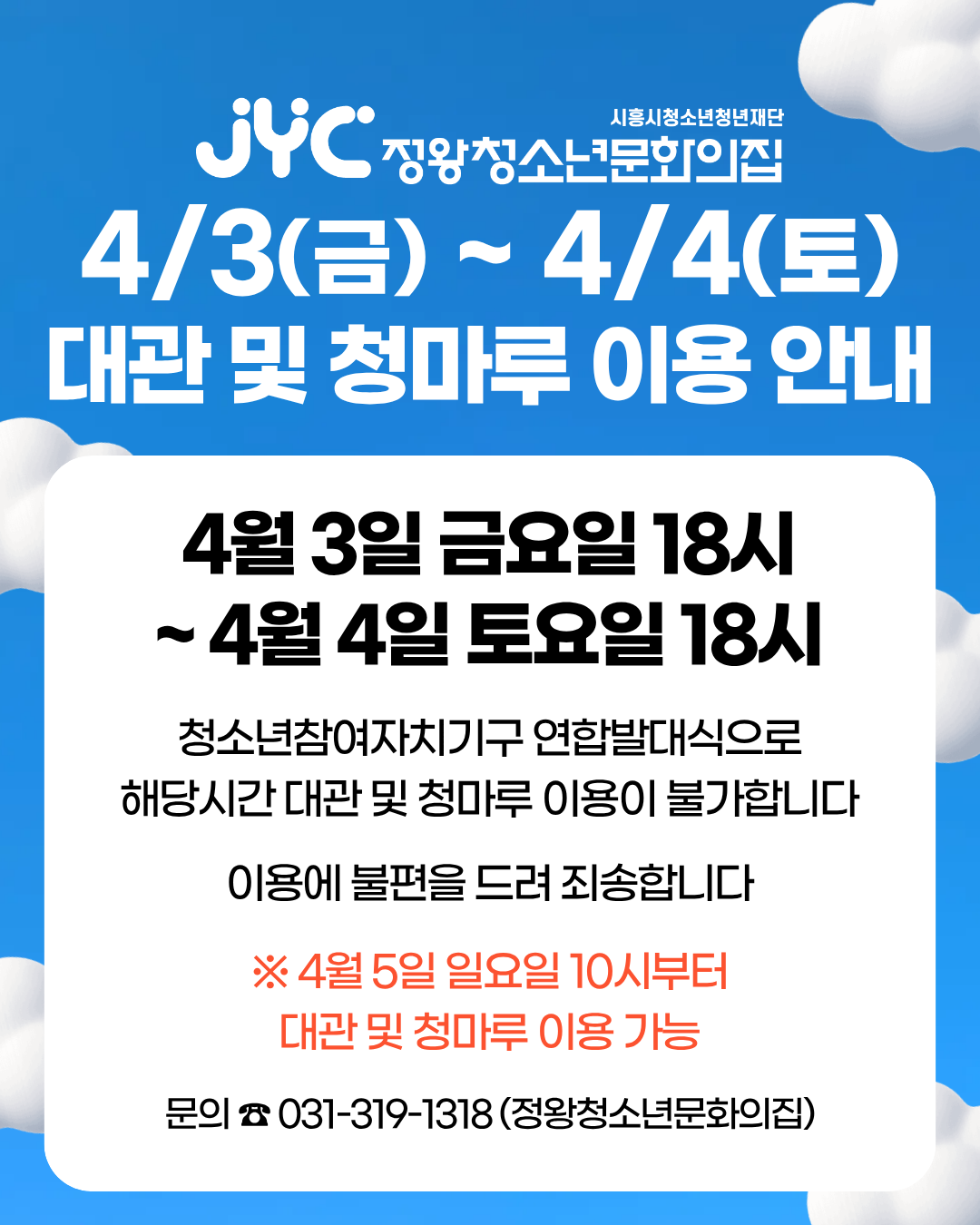 사이트 전체메뉴 시설소개 인사말 기관연혁 비전 및 미션 함께하는 사람들 시설이용안내 영상정보처리기기 오시는 길 청소년참여자치활동 청소년운영위원회 ‘함께’ 기관동아리연합회 '망고' 시흥시청소년환경감시단 연합네트워크 시화호청소년환경감시단 'B.S.A.S.' 청소년활동프로그램 청소년환경페스티벌 시화호청소년지속가능포럼 청소년환경국제교류 청소년기후행동프로젝트 이주배경청소년활동지원사업 문화다양성존중프로그램 청소년청년공간이용활성화 청소년방과후아카데미 청소년방과후아카데미 ‘울림’ 울림 공지사항 신청&대관 통합접수예약 바로가기 흥스(대관시설) 바로가기 알림마당 공지사항 채용정보 행사안내 활동소식 보도자료 자유게시판