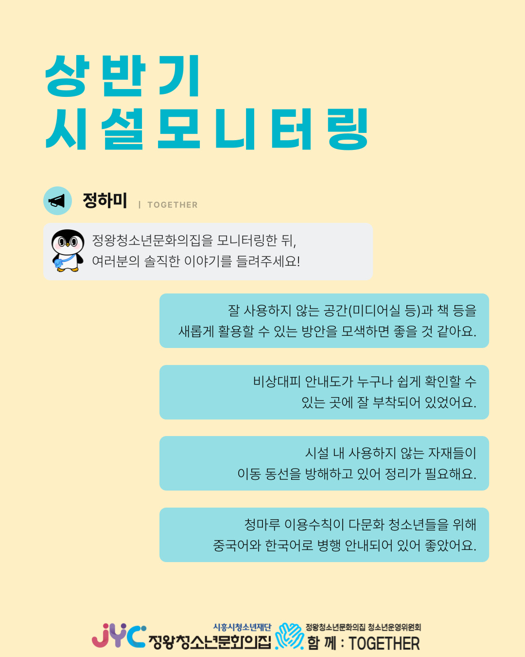 사이트 전체메뉴 시설소개 인사말 기관연혁 비전 및 미션 함께하는 사람들 시설이용안내 영상정보처리기기 오시는 길 청소년참여자치활동 청소년운영위원회 ‘함께’ 기관동아리연합회 '망고' 시흥시청소년환경감시단 연합네트워크 시화호청소년환경감시단 'B.S.A.S.' 청소년활동프로그램 청소년환경페스티벌 시화호청소년지속가능포럼 청소년환경국제교류 청소년기후행동프로젝트 이주배경청소년활동지원사업 문화다양성존중프로그램 청소년청년공간이용활성화 청소년방과후아카데미 청소년방과후아카데미 ‘울림’ 울림 공지사항 신청&대관 통합접수예약 바로가기 흥스(대관시설) 바로가기 알림마당 공지사항 채용정보 행사안내 활동소식 보도자료 자유게시판
