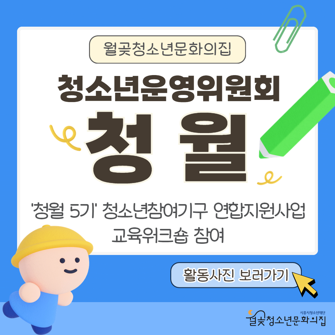 사이트 전체메뉴 시설소개 인사말 기관연혁 비전 및 미션 함께하는 사람들 시설이용안내 영상정보처리기기 오시는 길 청소년참여자치활동 청소년운영위원회 ‘청월’ 기관동아리연합회 '에뚜왈' 후기청소년(청년) 서포터즈 청소년활동프로그램 시흥시청소년예술제 디지털 시민교육 웰컴투 월청문 청소년AR실내운동회 플랫폼 SDGs 청소년사회참여프로젝트 만·족·행 『만들어가는 가족의 행복』 방과후아카데미 복덩이 소개 프로그램 소개 프로그램 공지사항 신청&대관 통합접수예약 바로가기 흥스(대관시설) 바로가기 알림마당 공지사항 채용정보 행사안내 활동소식 보도자료 자유게시판