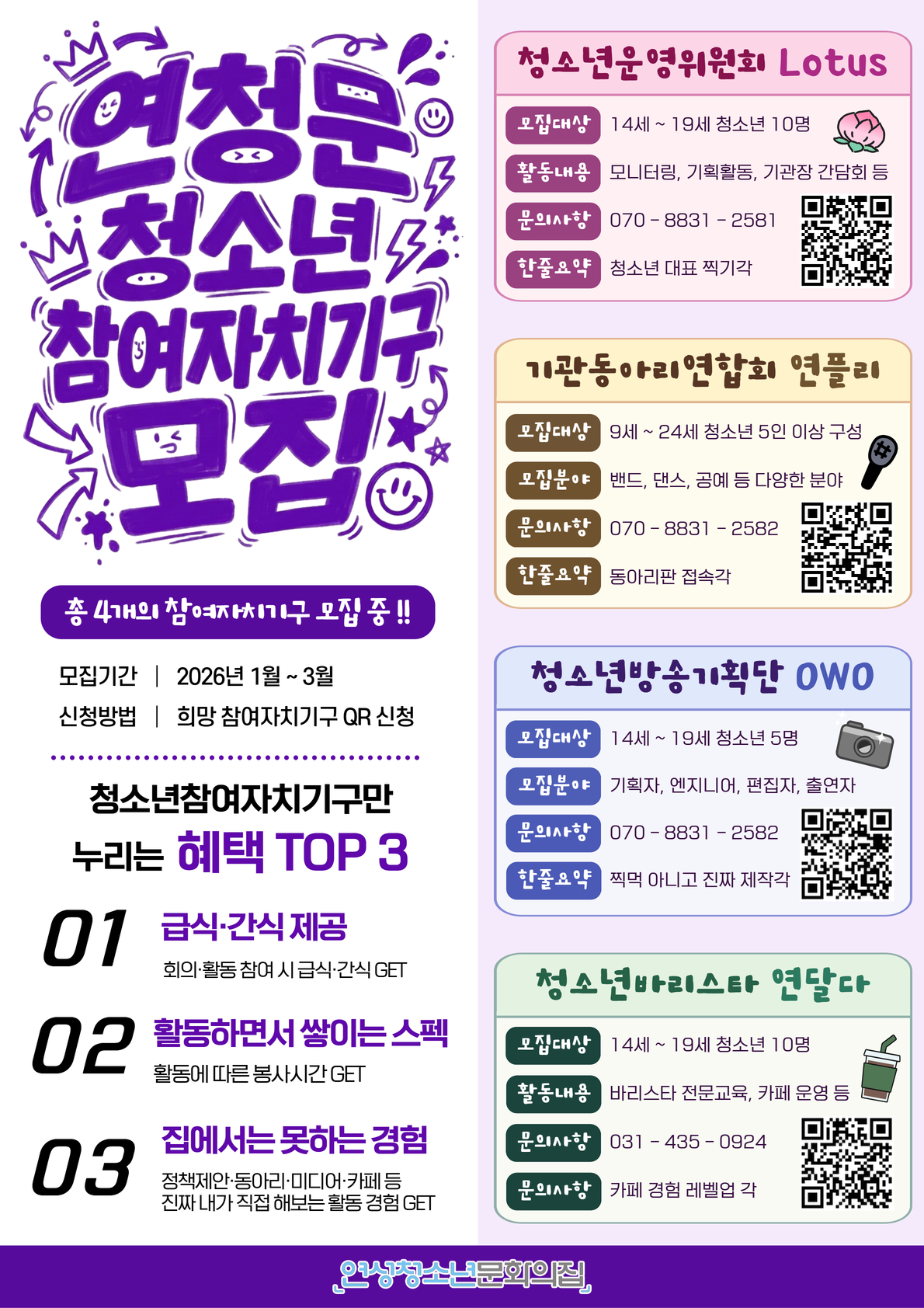 연성청소년문화의집에서 2026년을 함께 만들어갈 청소년참여자치기구를 모집합니다 💜
