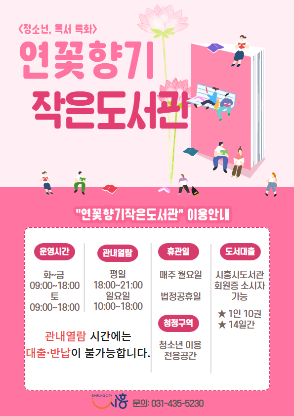 사이트 전체메뉴 시설소개 인사말 기관연혁 비전 및 미션 함께하는 사람들 시설이용안내 영상정보처리기기 오시는 길 청소년참여자치활동 청소년운영위원회 'Lotus' 기관동아리연합회 '연플리' 청소년바리스타 '연달다' 청소년활동프로그램 청소년・청년 공간이용 활성화(소통홀) 미디어특성화프로그램 미디어리터러시 : 팩트체크 시흥시전국청소년영상제 미디어특성화 도서문화특성화프로그램 독서토론프로그램 방학독서교실체험프로그램 사서희망학교 독서교육프로그램 학교 연계 독서문화프로그램 독후활동가프로그램 신청&대관 통합접수예약 바로가기 흥스(대관시설) 바로가기 알림마당 공지사항 채용정보 행사안내 활동소식 보도자료 자유게시판